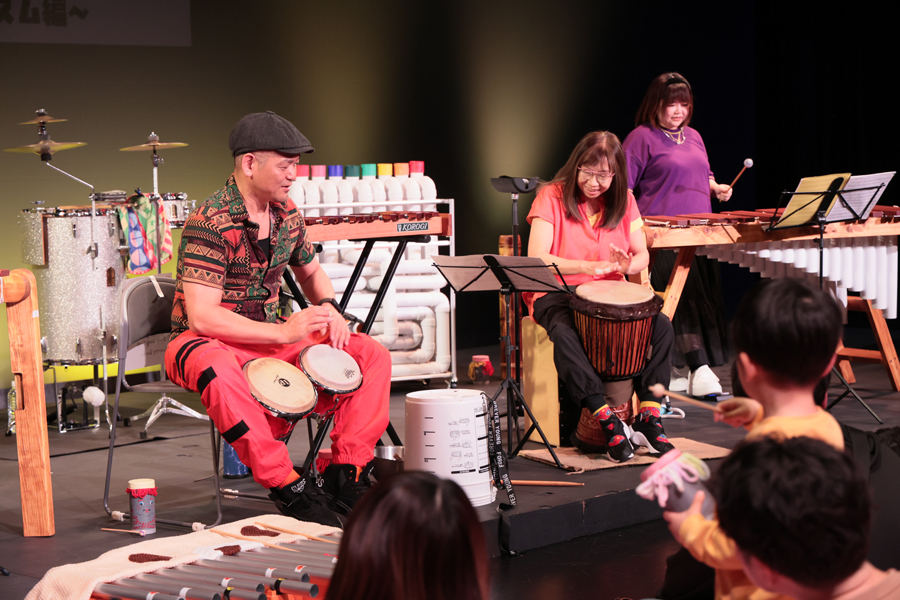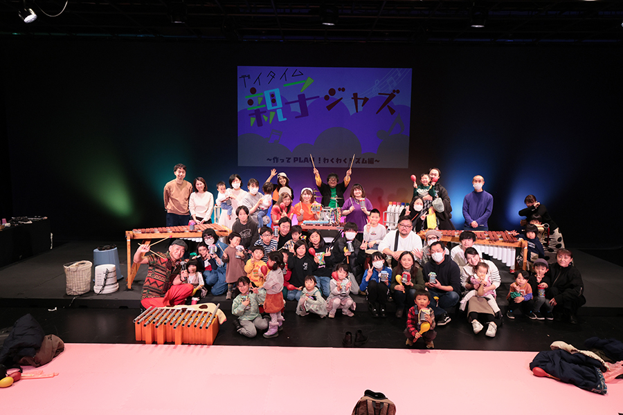 開演前の楽器づくりワークショップでは、小さな子どもたちがお父さんお母さんと一緒に手作りの楽器をつくって、ライブが始まれば、自然と作った楽器を叩いて、楽しい時間を共にしました。ライブ演奏と楽器づくりをしてくれたのは「瀧村正樹とトイ楽団」のみなさん。