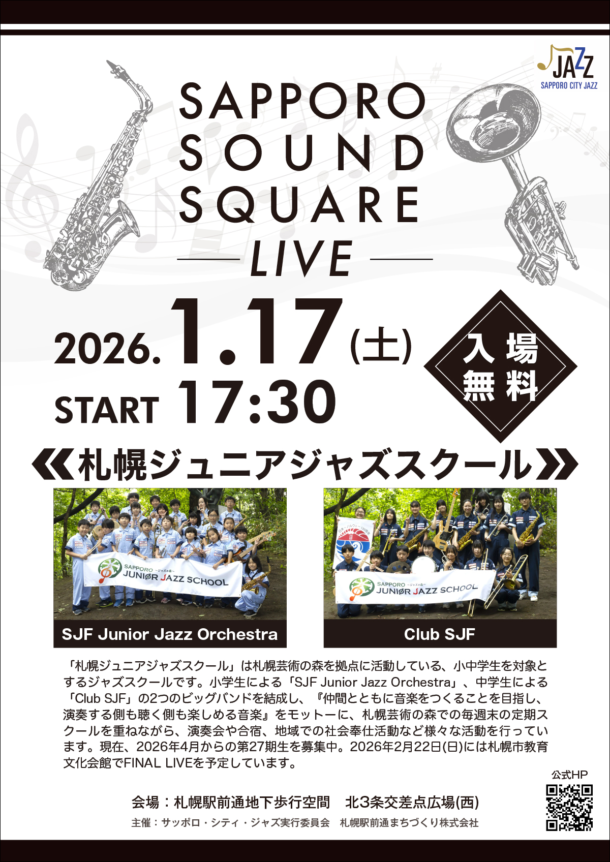 今週末1月17日(土)は、 札幌ジュニアジャズスクールが演奏します。17:30から「SJF Junior Jazz Orchestra(小学生クラス)」、続けて18:00から「SJF Junior Jazz Orchestra(中学生クラス)」のライブをお届けします!
